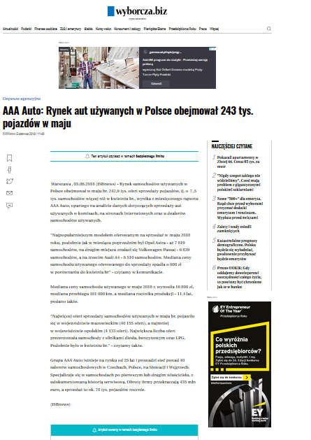 Wyborcza.biz: AAA Auto: Rynek aut używanych w Polsce obejmował 243 tys. pojazdów w maju